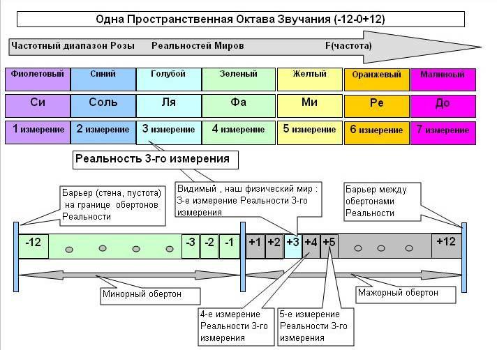 Роза Реальности Миров планеты Земля состоит из 7-ми диапазонов, это одна пространственная октава. Каждая из которых, в свою очередь, состоит из 12 мажорных обертонов, имеющих более высокую частоту вибрации звучания звука, атомов материи ее составляющих, и 12 минорных обертонов, имеющих более низкую частоту вибрации. Наш видимый, проявленный для глаза обычного человека, физический мир находится в третьем диапазоне мажорного обертона. На границе диапазона каждого обертона находится барьер, стена, « пустота», которая разделяет один диапазон Розы Реальности Миров от другого.