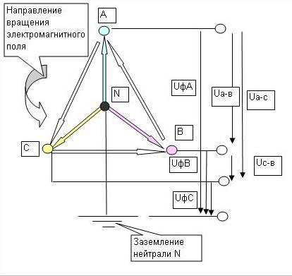 В электротехнике существует понятие «зазаемления нейтрали симметричной звезды напряжений». Если рассмотреть вектора звезды напряжений (эдс источника), образованной при вращении турбогенератора, то три вектора расположены симметрично, один относительно другого со сдвигом на 120 градусов. Фазные напряжения Uа,Uв,Uс измеряются относительно нулевой точки соединения нейтрали N и равны 220 вольт. Линейные, между фазные напряжения Uа-в,Uв-с,Uс-а равны 1,73*220=380 вольт. Нейтраль трехфазной системы заземляется. Потенциал в точке заземления равен нулю. Заземление нейтрали N приводит к симметрированию всех параметров трехфазной сети.