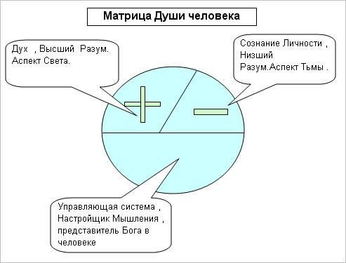 Матрица Души человека состоит из трех взаимозависимых частей: Дух, Разум и Управляющая Система. Разбираемся. Дух это Высший аспект Разума, Высшее Сознание человека, та индивидуальная частица Бога Отца в человеке, которая запушена для жизни и получения опыта в проявленном, плотном, физическом мире. Эта частица получает и сохраняет всю информацию, полученную при всех прожитых ею жизнях в различных телах человеческих. Эту чистую, высокочастотную энергию насыщающей жизни физического тела человека, можно сравнить с потоком положительной, чистой энергии света, добра. В математике это есть энергия со знаком плюс, что подразумевает излучение, отдачу, испускание света, знаний, любовь. Другая часть матрицы души это Сознание Личности, Низший Разум, желания, ощущения физического тела, организма. Они несут в себе аспект тьмы, привнесение низкой, отрицательной энергии, а также не любовь. Математически это есть энергия со знаком минус, что подразумевает поглощение, прием света, тьму. И третья составляющая матрицы души человека это его Управляющая система, его Настройщик Мышления, то что является функцией, законом управления этих двух величин. Если перейти на язык математики, то матрица Души есть функция Y= F(х), где Y-это Дух, Высший разум, Х-это Эго, Личность, Низший разум, а F это функция, закон управления этими двумя величинами, тот самый Божественный Настройщик Мышления. В новорожденном малыше, Y Дух, является латентной, ждущей своего часа, своего развития величиной. Он составляет малый процент от общего объема энергий Матрицы Души. Эго, эгоическая составляющая, личностная, которая является следствием желаний физиологического, плотного тела, это Низший Разум, низкочастотная составляющая Души. При рождении, она имеет превалирующий, больший процент энергий в общем объеме матрицы Души. Общий процент энергий (у+х), (Духа +Личности) не может превышать 49% процентов всего объема энергий этой тонкой структуры, хотя между собой эти величины могут иметь совершенно разное соотношение. Третья, управляющая часть Матрицы Души, Настройщик Мышления, всегда имеет полные 51% процентов. Это нейтральные энергии, с аспектом Бога Отца. Это не минус и не плюс, так как Бог Отец любит все свои Творения, все Создания, поэтому он нейтрален. Он только управляет, задает основные энергетические и допустимые, вероятностные параметры Матрицы Души. Он является той связующей функцией F, без которой не возможно, или нецелесообразно взаимное существование У и Х. Структура Матрицы Души построена так, что суммарная составляющая функций (Y +X) не могла бы вырасти более чем 49% от общего объема. Управляющая система всегда имеет свои 51%, поэтому она всегда имеет превалирующее влияние над суммой (Y+X). Это означает, что присутствие Бога в Матрице Души человека всегда является доминирующим фактором, основным вектором его духовного в развития. При росте организма ребенка, особенно после четвертого месяца, когда в него вселяется Настройщик Мышления, соотношение Духа и Личности начинается видоизменяться. Больший процент получаемой, входящей энергии приходится на энергии света, Духа, плюсовые энергии. В человеке, ставшем на Путь духовного развития, процент Высших духовных энергий начинает достигать до 90% процентов. Стоящий на Пути, Стремящийся к Высшему Знанию, постоянно усмиряя, беря свои эмоц