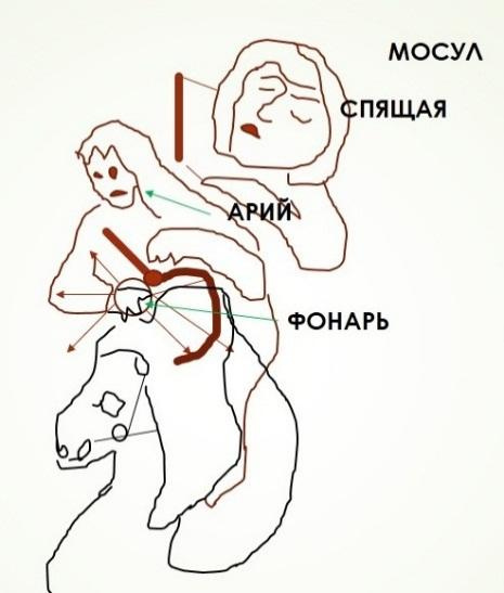 Посмотрим, насколько верна их информация. Начинаю с розового шара. На рельефе Саудовской Аравии видны арии, не один. Но арий в капюшоне держит в руке фонарь с отходящими лучами над головой лошади: