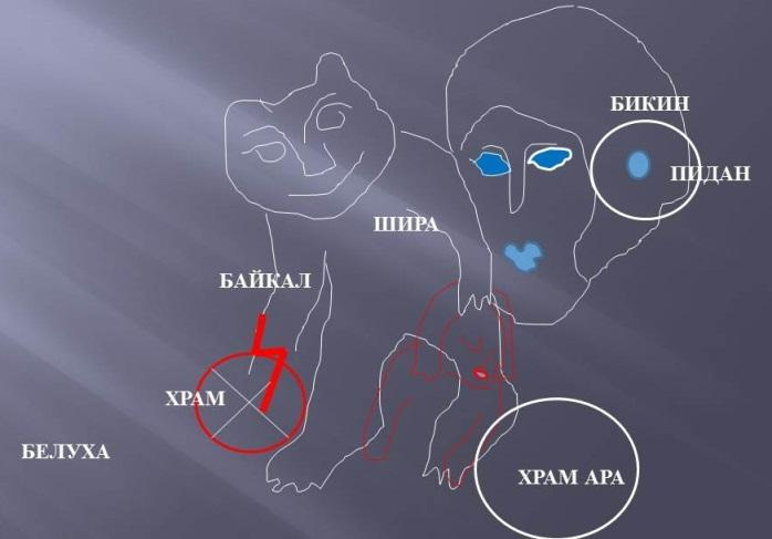 Хотелось бы ещё посмотреть, какой знак ариев есть на реке Шира. Зная, что искать, можно увидеть среди множества изгибов рельефа. Шира есть во Франции там уже нашла морду медведя, а по текстам на скалах уже поняла, что «Медведь ариив боже». Река Шира есть в Амурской области. Есть ли там медведь? Есть: