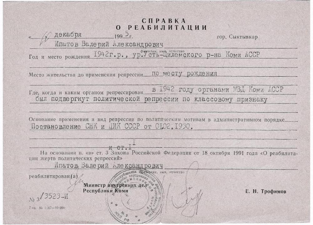 Справка о реабилитации моего отца Ипатова Валерия Александровича, выдана в 1995 году (из архива автора)