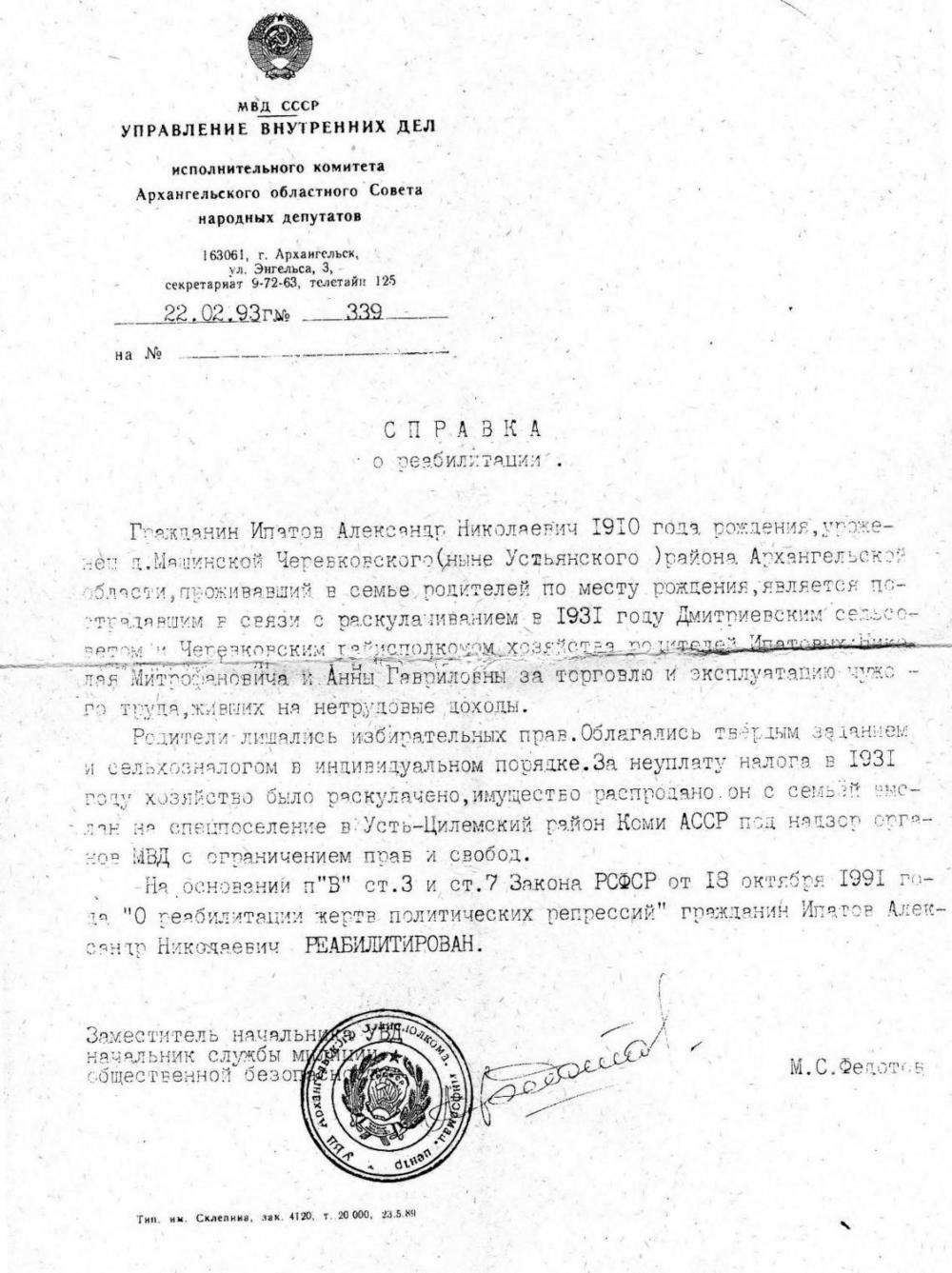 Расшифровка: «Справка о реабилитации. Гражданин Ипатов Александр Николаевич 1910 года рождения, уроженец д. Маньшинской Черевковского (ныне Устьянского) района Архангельской области, проживающий в семье родителей по месту рождения, является пострадавшим в связи с раскулачиванием в 1931 году Дмитриевским сельсоветом и Черевковским райисполкомом хозяйства родителей Ипатовых Николая Митрофановича и Анны Гавриловны за торговлю и эксплуатацию чужого труда, живших на нетрудовые доходы.