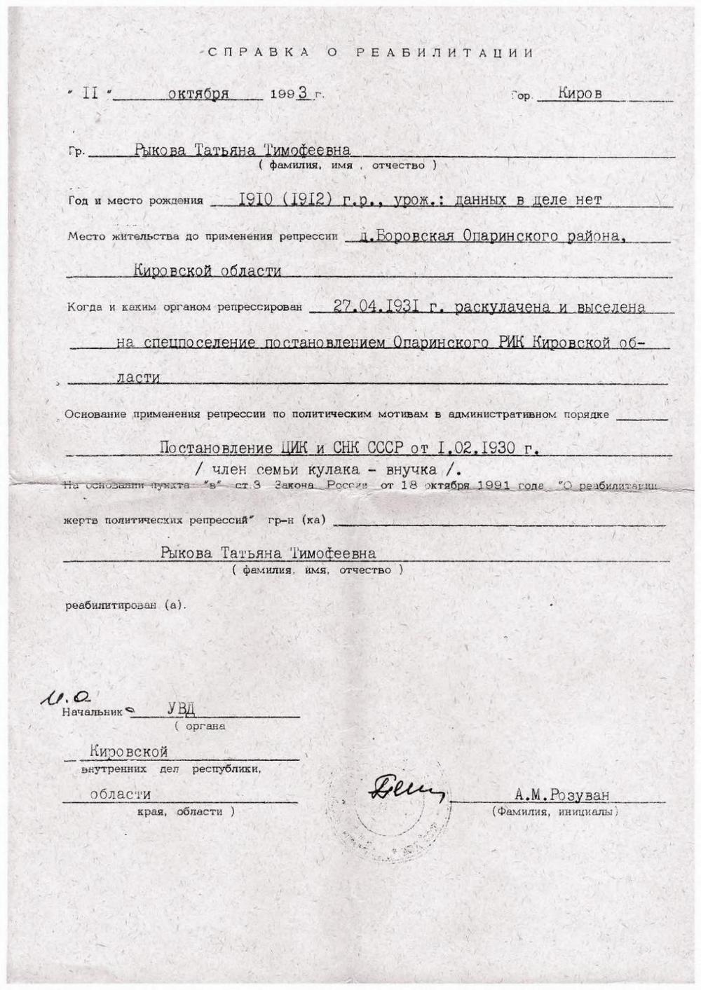 Справка о реабилитации моей бабушки Рыковой Татьяны Тимофеевны, выдана в 1993 году (из архива автора)
