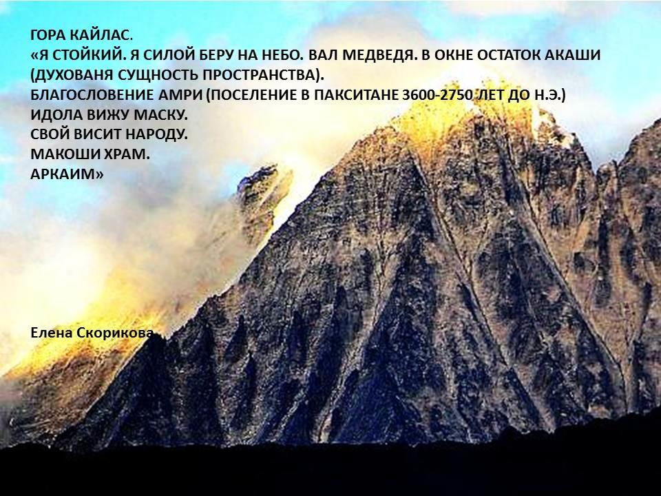 Духовный центр мира, находящий в Шамбале, по мнению жены Николая Константиновича Рериха Елены Ивановны Рерих, в будущем должен переместиться в Россию. Россия должна стать тем пространством, где духовное и материальное максимально сблизятся, и благодаря своему особому духовному пути, Россия обретет возможность стать новой Шамбалой» (https://zen.yandex.ru/media/zeitgeist/zachem-na-samom-dele-iskali-i-iscut-shambalu). Кажется, такой процесс уже идёт. Всё больше встречаю людей, прочитавших книги этих замечательных россиян, советую сделать это всем. Особенно, если эти же знания даны нам Высшими (Божественными) существами на самой планете Земля надписями и портретами по всей её поверхности. Напоследок, раз речь пошла о Шамбале, находящейся, по легендам, в районе Кайласа, приведу текст с его скал: