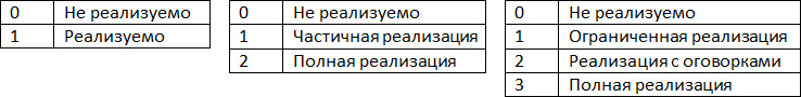 По своей сути метод интегральных оценок повторяет качественный анализ, но с одним отличием в матрице соответствия вместо качественных вводятся количественные оценки. В ячейках матрицы проставляются числовые значения, отражающие, насколько объект анализа поддерживает (другими словами, в какой степени реализует) соответствующее требование. Диапазон возможных значений задается шкалой оценок, которая зависит от точности, которую мы хотим получить. Примеры различных шкал оценок изображены на Рис. 16.
