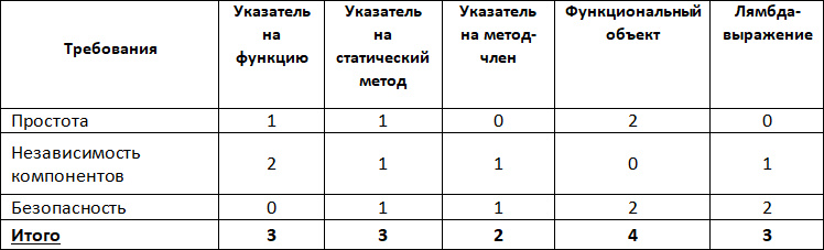 Как видим, после введения коэффициентов важности результаты изменились: теперь максимальное количество балов набирают две реализации указатель на функцию и лямбда-выражение.