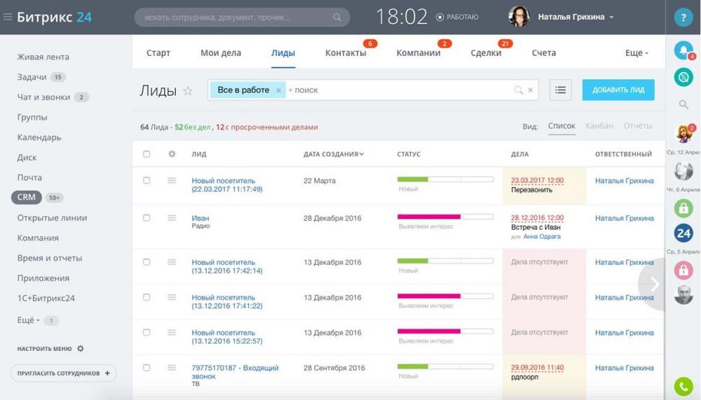 1. Лиды. Как было уже не раз сказано, Лид это еще не клиент, это лишь выраженный возможным клиентом интерес. Наличие у вашей компании лидов дает возможность продавцам начинать и заключать новые сделки. Однако все эти лиды откуда-то должны появляться, верно? В CRM Битрикс24 есть возможность вносить каждый лид вручную (к примеру, менеджер может обрабатывать записки после выставки, в которой он участвовал), можно также импортировать целый список лидов (из стандартного файла из привычной электронной таблицы). Но все же наиболее логичным будет путь появления лидов в CRM автоматически и вы уже начали получать лиды из всех тех каналов, которые подключили к CRM.