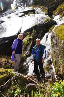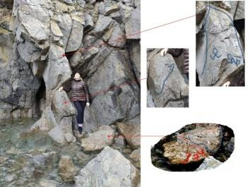 Зуевский водопад предстал во всей красе с высоты противоположного склона ущелья. Длина его метров 200. Как сказал Станислав Владимирович, вода на его камнях редкость. Но нам повезло, хотя она помешала увидеть надписи на мегалитической основе. Спустя годы, я заметила ещё кое-что на каменном склоне водопада: огромное лицо, смотревшее на нас, и не одно: