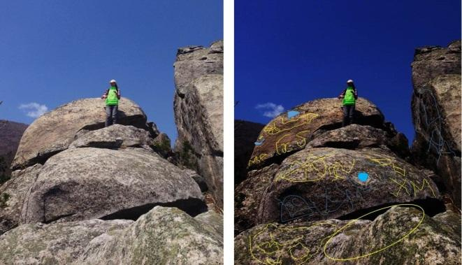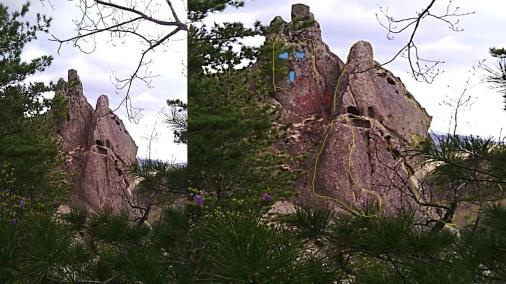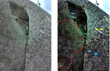 Глобально, на левой боковой скале виден профиль человека. А прямо, с учётом игры тени, вырисовывается морда зверя. В нижнем правом углу можете увидеть голову лежащего человека с закрытыми глазами и с надписями на лбу: