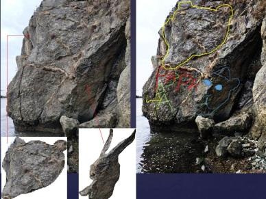 На мегалите слева видна голова с чашей над ней, ниже, над бровью человека изображение школьного транспортира (так изображается созвездие Печь, которое уже видели на скале за Рудно-Пристанским маяком):