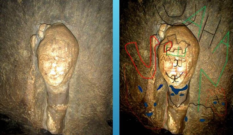 С увеличением контрастности, справа на скалах видим и голову старца с бородой, ниже голову молодого человека, выбитых в камне змея, лебедя и орбиты планет или звёзд. На голове старца выпирает из плоскости камня буква О и М. Это знаменитый звук буддистов «Ом». Ниже, по лицу молодого человека выбито: «Митра», опять он связыватель миров космоса. По глазам и бровям существа на левом от читателя камне явно видны буквы Т, между ними А, М, что позволяет прочитать: «Там Тартара», а это Большая Медведица: