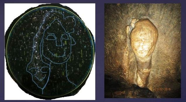 Её брови выложены светлым камнем, которые ещё образуют ореол сердца. Кроме этого, на скале выбиты орбиты планет: