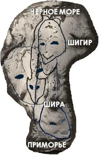 Написано: «Тор Шивы. Ван ара. Мати ара. Тары оки (глаза). Шигир». Шигир река в России, протекает по Челябинской области. Посмотрите на рельеф планеты в районе реки Шигир до реки Шира и увидите очень много совпадений с пещерным изображением: