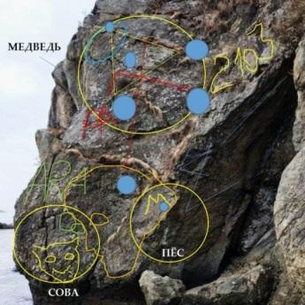 Звезда Медведицы уходит с орбиты к созвездию ария между Псом и Совой. Голова ария выделена на скале линией между совой и псом. Между ними выбито изображение зайца. Посмотрите на карту звёздного неба и вы увидите, что созвездия Большого Пса, Зайца находятся рядом. Орион тоже недалеко.