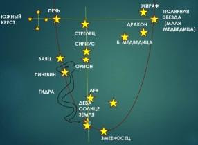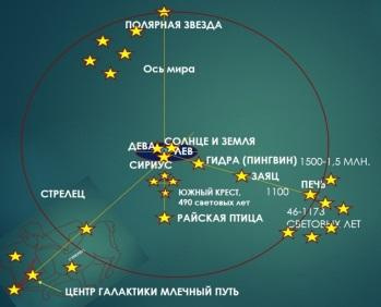 Синий овал разделяет Северное и Южное полушария небосвода Земли. Учитывая галактические расстояния, Южный Крест лежит на одной линии с созвездием Льва, Девы, с Сириусом и с Солнцем, вместе с Землёй. Они сливаются, практически, в одну точку. И Солнце оказывается 25 декабря в созвездии Стрельца распято на Южном Кресте, сливаясь с ним по оси мира. Южный Крест будет виден в Северном Полушарии с 14000 года новой эры, до этого он был там ранее 2000 года до новой эры (Википедия). Между созвездием Стрельца и созвездием Печь угол в 90 градусов. Это может подтверждать случай поворота оси Земли на 90 градусов. Многие звёзды принадлежат совсем другим мирам, чем человечество их прописало, наблюдая с Земли: