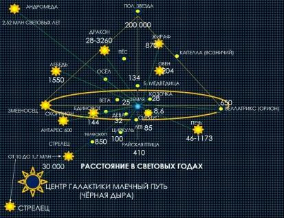 Как видите, центр галактики Млечный путь удалён от Земли всего на 30000 световых лет (все данные есть в Википедии), а самая яркая звезда Андромеды удалена на 2,5 миллиона световых лет! И Полярная звезда Малой Медведицы удалена дальше, чем Чёрная Дыра (правда, профессор Валентина Миронова сказала, что чёрной дыра там уже нет, https://urusel.ru/sovremennye-otkrytija-v-nauke-i-tehnike/valentina-mironova-mir-posle-kvantovogo-perehoda-chast-1/) в центре нашей галактики, на 200000 световых лет! И заметьте, что звёзды не лежат на поверхности одной сферы нашего небосвода, звёзды созвездий лежат на разных расстояниях от Земли. Расстояния определены для самых ярких звёзд сверхгигантов созвездий и туманностей. У Стрельца, например, самые яркие звёзды находятся от нас от 10 до 1,7 миллиона световых лет! Поэтому, соединения звёзд линиями, как мы видим на современных картах небосвода, совсем не соответствуют их истинному положению. Я не скажу вам, что мною, с подсказками от древних каменных посланий, открыты все тайны мироздания и без ошибок, но каменные тексты дали многое понять и по ним можно издавать новый, более интересный учебник Астрономии.