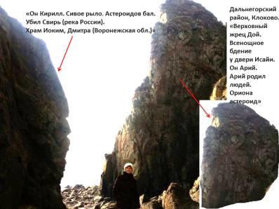 «Эпоха Ара Иса. Храм Солнца. Обь граница. Низ Тиры. Один у Камы». Обратите внимание на камень внизу фотографии: он очень похож на лежащего динозаврика с ушами. Иса это одно из имён Иисуса. Одина у Камы я показала выше, а Тира это древнее государство, располагавшееся от Днестра до Оби. На берегу бухты лежит валун, похожий на голову змея. Сколько были там, но не обращали на него внимания. В этом году нас, 15 добровольцев, пригласили приехать туда убрать мусор за некоторыми нашими дальнегорцами (собрали 30 полных мешков бутылок, банок и пластика с бумагой и детскими подгузниками, бумага не исчезает и не растворяется), тогда и обратила на него внимание. Фотография показала наличие на нём букв: