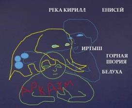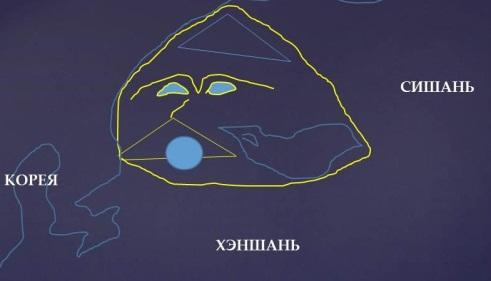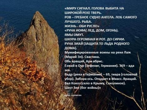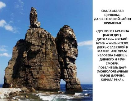 Рядом с фотографией приведён текст, полученный с неё. И снова об Ариях и их святом месте реке Кирилл. Скала является копией центра рельефа Центральной Азии, если, опять же, смотреть от Приморья: