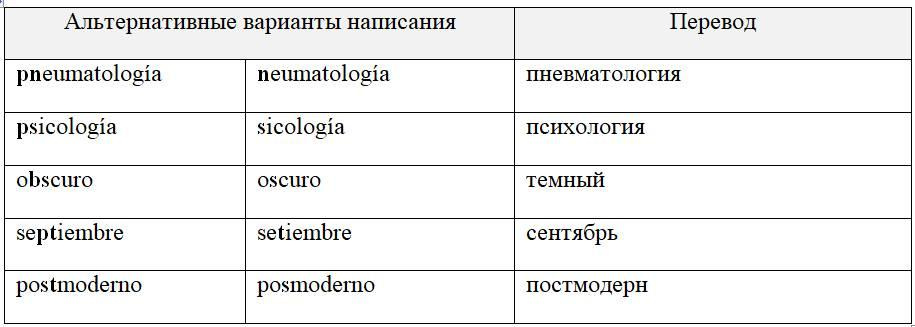 Среди устоявшихся пар разных согласных выделим pn и ps в начале слова, bs в конце слога, pt на стыке слогов, а также st в предлоге post. Поскольку испанцам трудно произносить такие сочетания звуков, часто в речи первая буква «вымывается». Этот феномен настолько распространен, что получил отражение в письменной речи: