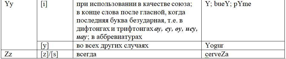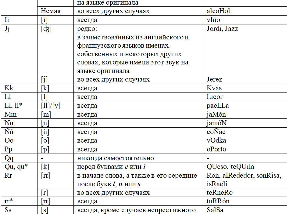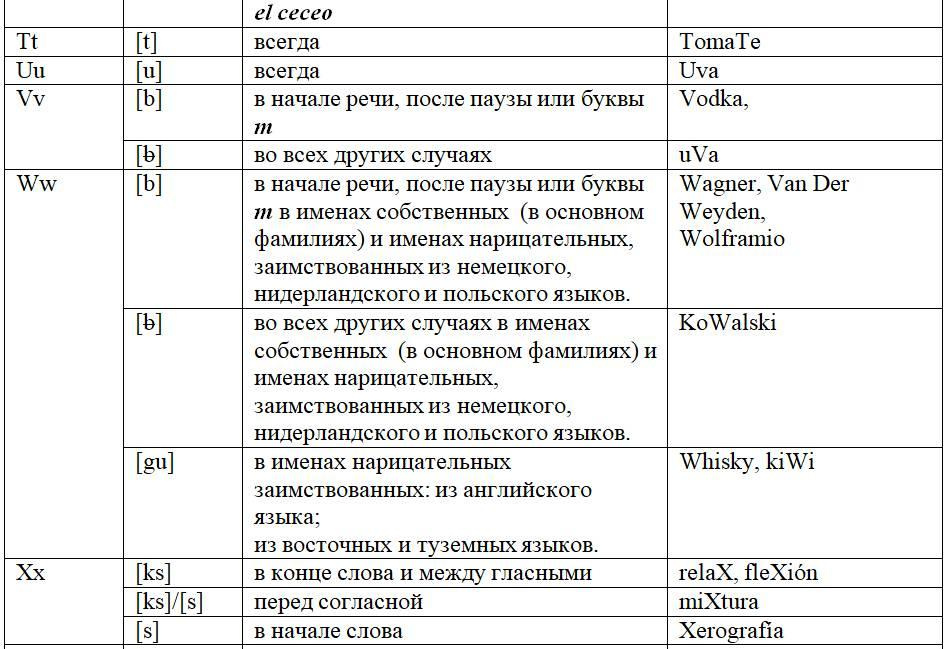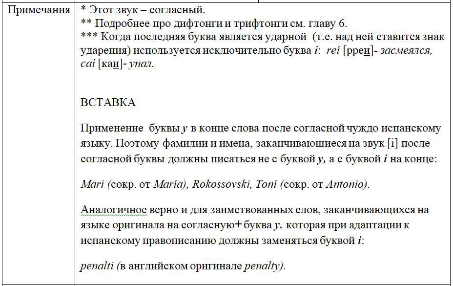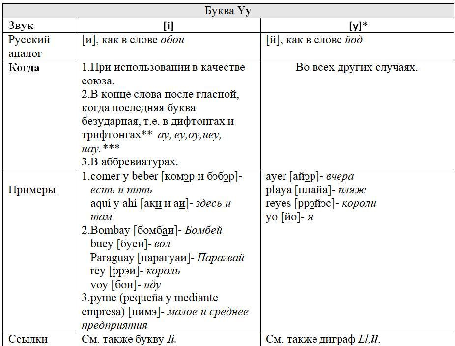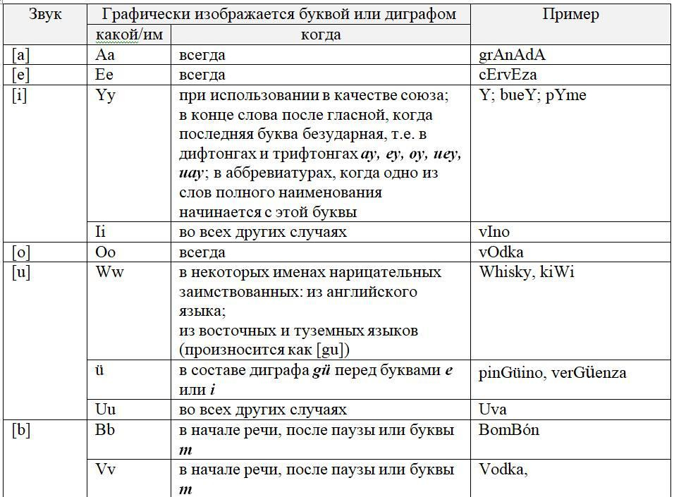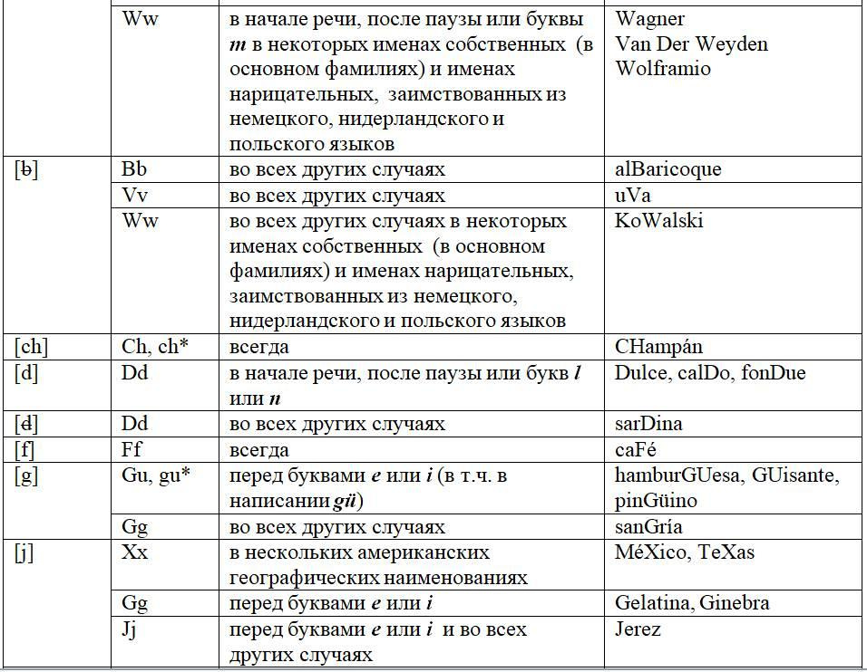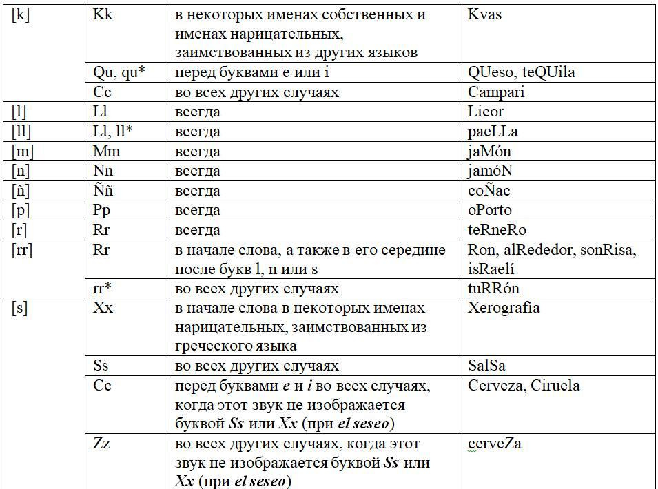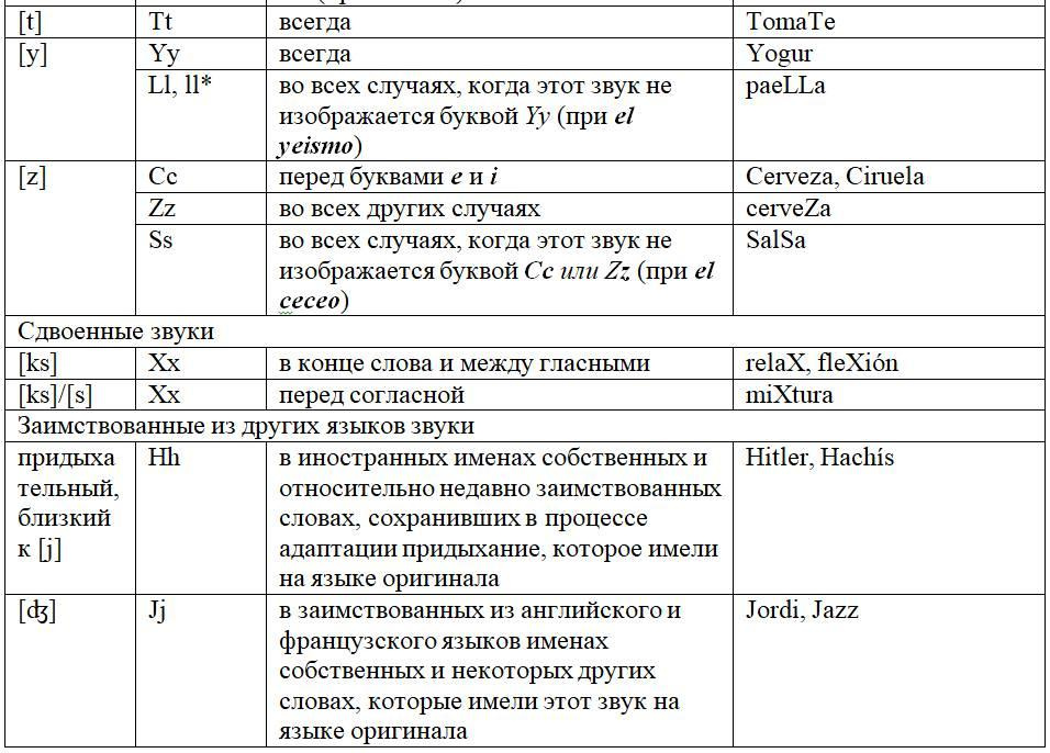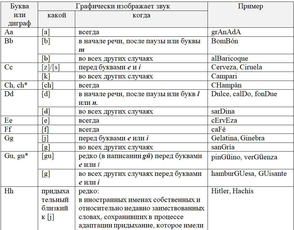 Как следует из предыдущих глав, с одной стороны, некоторые письменные знаки (буквы и диграфы) могут обозначать разные звуки или разные оттенки звука в зависимости от своего местоположения в слове или во фразе, с другой некоторые звуки могут обозначаться разными знаками. Кроме того, буквы и диграфы могут иметь различное звучание по различным испаноговорящим регионам мира. Ниже, для удобства читателя приведены две таблицы, кратко и наглядно резюмирующие весь изученный нами материал. Первая систематизирует этот материал на базе знаков (27 букв и 5 диграфов), вторая на базе звуков испанского языка (24 звука, из них два в двух вариантах: взрывном и щелевом), а также заимствованных звуков. Диграфы в обеих таблицах отмечены знаком «*».