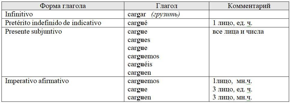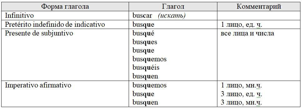 Если глагол в инфинитиве заканчивается на -car, то при спряжении буква с перед буквами e или i замещается диграфом qu: