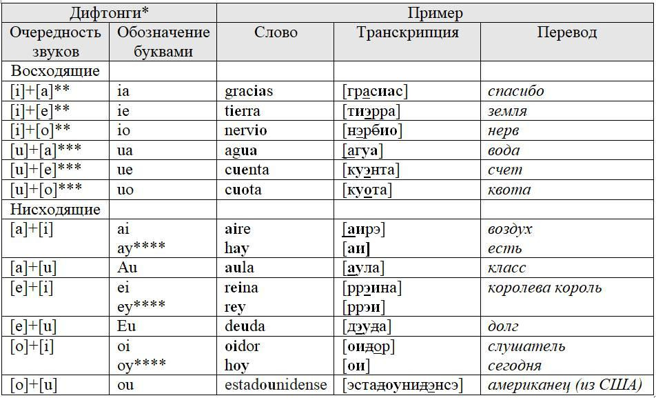 Примечание: *Немая буква Hh между двумя гласными не препятствует образованию дифтонга, например ahumar [аумар] коптить. **Звук [i] в восходящем дифтонге в начале слога произносится как русский согласный звук [й], например iodo[йодо] йод, hierba [йэрба] трава. Аналогичное возможно не только в начале слога. Например, слово tierra часть испаноговорящих произносит как [тйэрра].***Звук [u] в восходящем дифтонге может звучать близко к русскому [в], например [агва], [квэнта], [квота]. Нечто похожее происходит и в нашем языке, когда дети слово какао произносят как [какаво] ****Только в конце слова (подробнее см. таблицу букваYy главы 3).