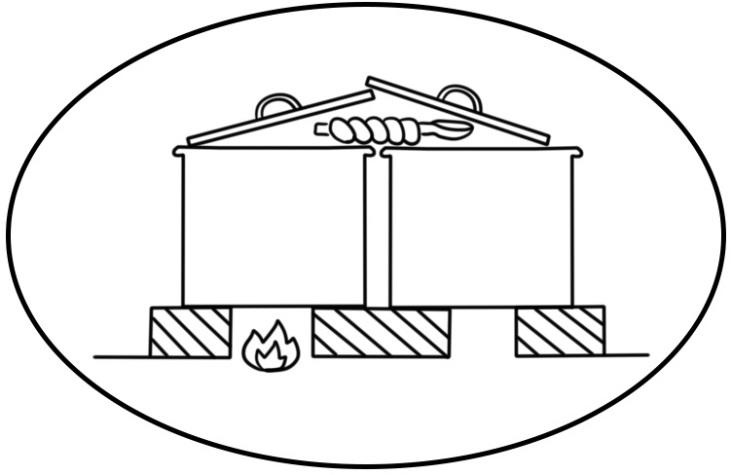 Обыкновенная столовая ложка или примерно такого же размера ветка обматывается вкруговую тряпкой или сухой травой и укладывается на два стоящих рядом котелка, кастрюли или металлические банки. Сверху котелки и палочка накрываются крышками, как показано на рисунке. Под первым котелком разводится слабый огонь, при этом надо стараться, чтобы второй котелок не нагревался. Испаряющаяся вода будет осаждаться на крышках и по ветке стекать во второй котелок. За 34 ч работы куба подобным образом можно получить до 1 л дистиллированной воды.