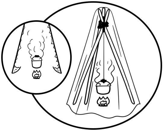 Паровой опреснитель большей производительности можно сделать из куска полиэтиленовой пленки, ёмкости и нескольких жердей. Для этого жерди следует установить треножником, подвесить на них емкость и обмотать сверху полиэтиленовой пленкой. При этом в верхней части «кулька» следует оставить отверстие для вытяжки дыма, а нижние концы подвернуть внутрь на 1015 см и слегка задрать вверх, чтобы образовались своеобразные карманы-углубления. Теперь если под емкостью развести костер и довести воду до кипения, то пар будет конденсироваться на пленке и стекать вниз, в образованные подвернутыми краями полиэтилена карманы (рис. 19).