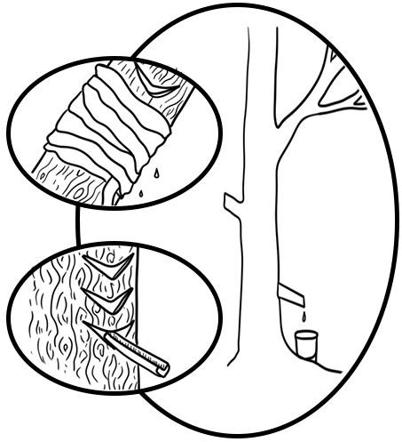 Весной для утоления жажды можно с успехом использовать сок березы. Для этого в коре нестарой березы просверливается или прорезается в виде буквы «V» несколько небольших расположенных друг над другом отверстий. В них вставляются веточки или свернутые желобком листочки, предназначенные для стекания выступившего сока. У основания дерева устанавливается емкость для сбора капающего сока. Подсчитано, что за день от пяти берез возможно «накапать» таким образом до 20 л сока (рис. 20).