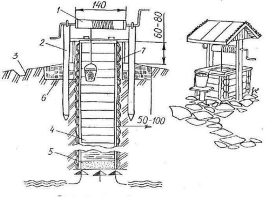 Для устройства колодца отрывают шахту на 510 см больше нужных размеров сруба и глубиной 25 м в зависимости от надежности и устойчивости грунта. Затем устанавливают сруб, наращивая его снизу вверх, начиная с основного нижнего венца, располагаемого на дне шахты.