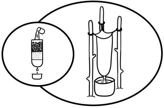 Можно изобрести и более простой тканевый фильтр. Например, выкопать в грунте ямку, поставить туда емкость, сверху из веток деревьев соорудить импровизированную решетку настил, на которую уложить слой ткани. В центре ткань желательно продавить, чтобы образовалась направляющая воронка для стекания жидкости в емкость. После этого на ткань нагрести толстый слой песка, песок укрыть следующим куском ткани, сверху насыпать древесный уголь, снова укрыть тканью и снова уложить фильтрующее вещество. Таких слоев может быть несколько чем больше, тем лучше.