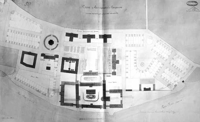 Прямоугольные наделы с жилыми домами протянулись вдоль Шлиссельбургского тракта и вдоль берега Невы; в глубине они образовали полукруглую (в дальнейшем превращенную в круглую) площадь. Эта часть территории мануфактуры прообраз жилых рабочих городков начала XX в. Схожий прием использовал А.Д. Захаров в нереализованном проекте Гатчинского воспитательного селения, разработанном им в 1809 г.[76] Это обстоятельство, а также участие самого зодчего, его учеников и других выпускников Академии художеств в строительстве некоторых зданий на территории Александровской мануфактуры позволяет судить о «захаровской» школе в формировании уникального ансамбля. В процессе своей преподавательской деятельности зодчий, стремясь развить рационалистический подход у многочисленных учеников в решении архитектурных задач, предлагал для учебных проектов темы, носившие утилитарный характер. Известно, что Захаров курировал и утверждал постройки Александровской мануфактуры и Ижорского завода.