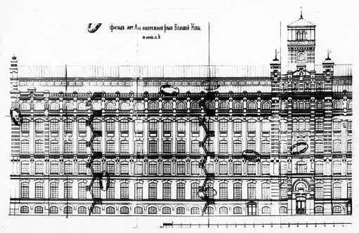 Архитектор Л.Л. Петерсон разработал в 1895 г. проект нового фабричного здания, по которому сгоревший главный корпус старой фабрики и примыкавшие к нему лицевые вспомогательные корпуса подлежали сносу, а надворные капитальной реконструкции. Академик архитектуры Людвиг Людвигович Петерсон (18421902) участвовал в сооружении и других фабрик наследников Штиглица, в частности построек Нарвской льнопрядильной мануфактуры в Ивангороде.