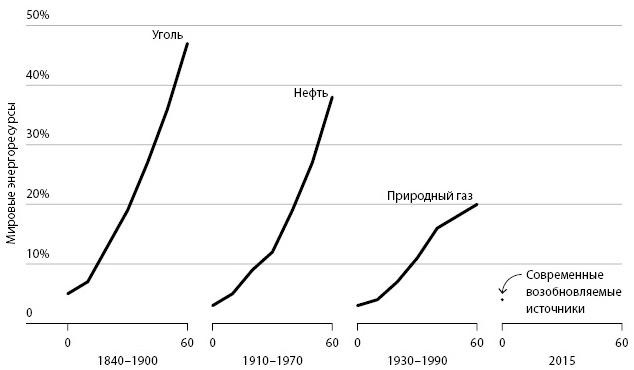 Давайте вспомним, уважаемые читатели, сколько времени понадобилось на то, чтобы нефть стала важным источником энергии[31]. Ее добыча в коммерческих масштабах началась в 1860-х годах. Полвека спустя на нефть приходилось всего 10% мирового производства энергии. Прошло еще 30 лет, прежде чем этот показатель составил 25%.