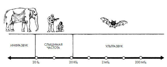 Рис. 7.2. Диапазон звуков в Гц, включая частоты, воспринимаемые человеком