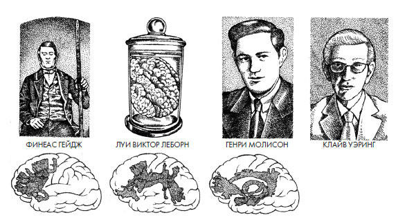 Рис. 10.1. Финеас Гейдж, Луи Виктор Леборн, Генри Молисон и Клайв Уэринг, срезы мозга Гейджа, Леборна и Молисона, полученные в исследовании 2015 года, проведенном де Шоттеном и его коллегами. Единственная известная фотография Леборна это фотография его консервированного мозга в банке. В соответствии с данными де Шоттена и др. (2015)