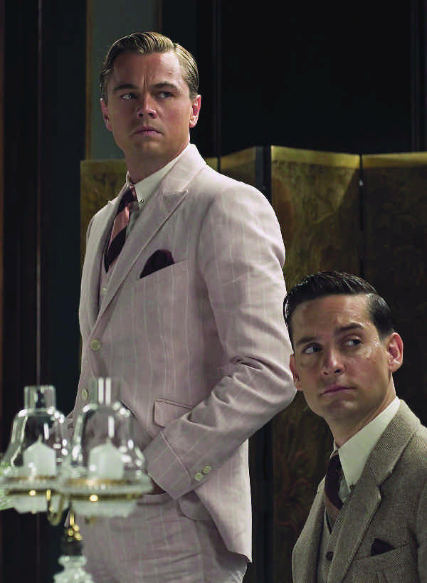 Портной Мартин Гринфилд хорошо известен в кино и телеиндустрии. Он несколько раз сотрудничал с Brooks Brothers, а также лично шил костюмы для таких лент, как «Волк с Уолл-стрит» (2013), сериалов «Подпольная империя» (20102014) и «Больница Никербокер» (2014). Эскизы костюмов для ДиКаприо и Магуайра нашла Кэтрин Мартин, а сшили их Гринфилд и его команда. Кэтрин хотела добиться полного совпадения с тем, что было в реальной жизни. Щегольский розовый костюм в тонкую полоску, в котором Гэтсби предстал во время поездки с Дейзи в нью-йоркский отель «Плаза», зрители ожидали увидеть в фильме, после того как Роберт Рэдфорд появлялся в подобном запоминающемся наряде в киноверсии 1974 года. Мартин смогла подтвердить достоверность костюма с помощью архива Brooks Brothers. Она выяснила, что Brooks Brothers первыми в США шили такие костюмы из ткани в крепированную полоску начиная с конца девятнадцатого века. Хотя Brooks Brothers компания патриотичная, силуэт их костюма однобортный пиджак и брюки из такого же материала был создан под сильным влиянием Сэвил-роу поздневикторианской эпохи. Точно так же для модели сорочки с воротником на пуговицах, которую, как утверждают в Brooks Brothers, изобрела именно их компания, прототипом послужила английская сорочка для игроков в поло, уголки воротника которой пристегивались пуговицами, чтобы удерживать их на месте во время игры. Мужской костюм с просторным пиджаком, на котором не было вытачек, а спинка имела шов по центру, больше всего соответствует истинно американскому стилю. Именно такими и славилась марка Brooks Brothers. Тем не менее для «Великого Гэтсби» по просьбе Кэтрин Мартин фирма сшила совершенно другие костюмы.