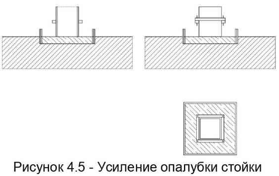 Если прочность опалубки стойки вызывает сомнение, производится усиление опалубки, как показано на рисунке 4.5. Для этого выпиливаются 4 бруска сечением 75×50 мм. Бруски стыкуются внахлёст в углах опалубки, как показано на рисунке 4.5. Друг с другом бруски соединяются с помощью стержней арматуры, которые вставляются в заранее просверленные на месте стыка отверстия. Усиление к опалубке крепится на шурупах.