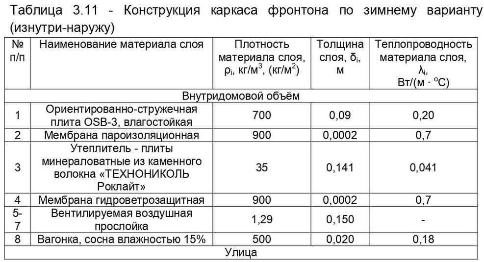 Таблица 3.11 Конструкция каркаса фронтона по зимнему варианту (изнутри-наружу)