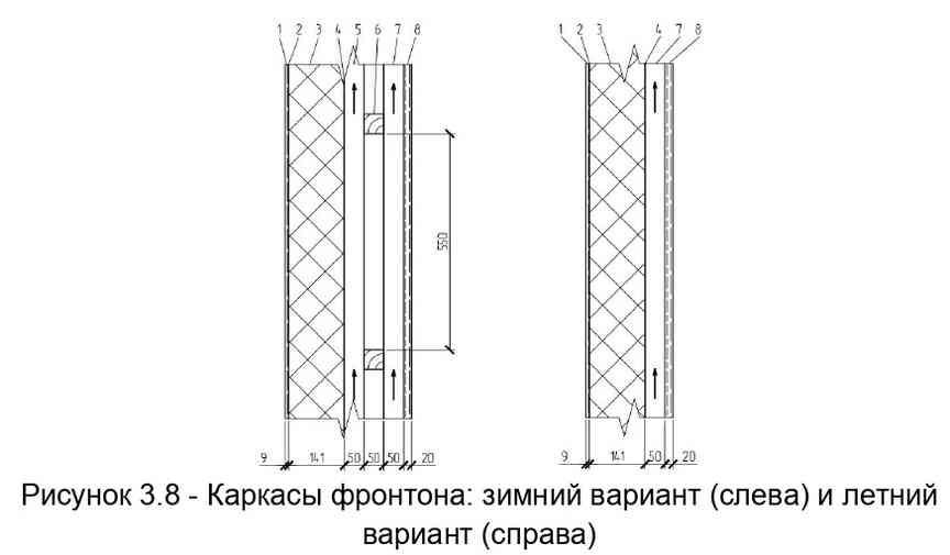 При определении условного сопротивления теплопередаче фронтона слои, лежащие за вентилируемой воздушной прослойкой (при рассмотрении конструкции изнутри-наружу), а так же сама вентилируемая воздушная прослойка в расчёт не принимались.
