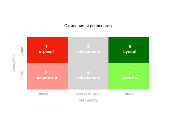 Когда реальность совпадает с вашим положительным ожиданием или выше отрицательного, вы испытываете либо слегка приятные эмоции, либо абсолютно нейтральные (ситуации 6 и 3). Например, вы ожидали получить хороший сервис в массажном салоне, вы его и получили. Чуть более приятно или нейтрально зависит от того, как часто вы пользуетесь этим салоном. В конце концов, вы просто принимаете работу его персонала как должное. Тем временем в салоне могут считать, что у них супервысокий уровень сервиса, потому что они знают, сколько усилий потратили на его создание, а вы нет.