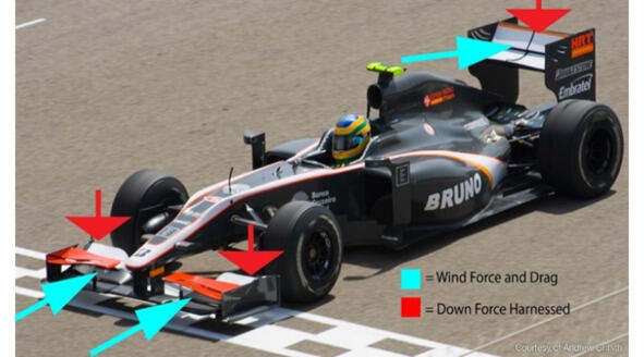 Интересно рассмотреть и примеры на использование принципа противоположного подъемному крылу. Не компенсировать вес объекта, а создать дополнительный вес или прижимающую силу. Этот принцип используется в автомобилях (обратное крыло), для прижима их к дороге. Особенно это важно при больших скоростях движения в гоночных автомобилях, например, гоночные автомобили в Формуле-1 (англ. FIA Formula One World Championship) имеют переднее и заднее антикрылья. В скоростных поездах локомотив выполнен в виде обратного крыла и т. д.