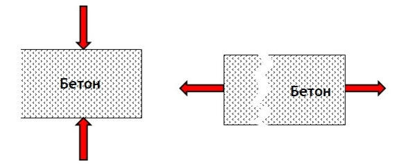Бетон хорошо выдерживает большие нагрузки на сжатие, но не выдерживает нагрузки на растяжение.