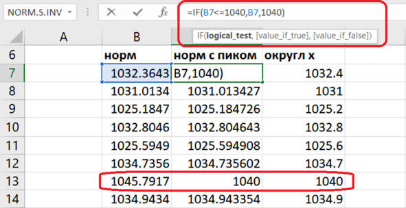 Смоделируем описанную ситуацию. Вначале сгенерируем нормальное распределение как в п.9.1. Затем заменим данные, выходящие за ВГД, на границу допуска. Будем использовать функцию IF для проверки условия