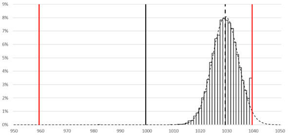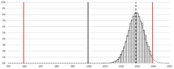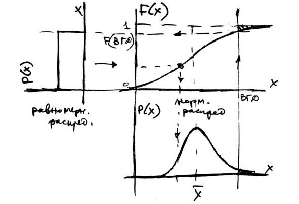 Чтобы смоделировать случайную величину с усечённым распределением, используем метод функционального преобразования как в п. 9.3. В данном случае будет небольшое отличие. Стандартный подход это равномерное распределение на интервале от 0 до 1. Далее случайную величину пропускают через обратную функцию заданного распределения. В случае усечённого распределения придётся использовать равномерное распределение на интервале от 0 до F (ВГД). Здесь F (x) интегральная функция заданного распределения (нормальное, со средним 1030 и сигмой 5), см. рис. 9.9.2.