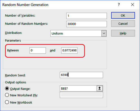 Находим значение уровня, на котором будем отсекать интегральную функцию (рис. 9.9.3). Сгенерируем равномерное распределение на интервале от 0 до полученного значения 0.977249868 (рис. 9.9.4). Пропускаем его через обратную функцию нормального распределения. Строим гистограмму (рис. 9.9.5). На графике видно, что гистограмма резко обрывается у правой границы допуска.