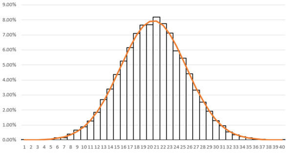Рассматриваем график. Все три требования выполняются. Кроме того, общие очертания гистограммы соответствуют нанесённой на график кривой нормального распределения.
