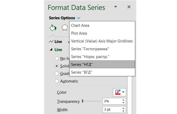 Настраиваем тип и цвет линий в меню Format Data Series. Щёлкаем на графике по нужной линии. Если при настройке сложно выделить нужную линию на графике, используем выпадающий список Series Options. В нашем примере видим четыре ряда данных. Выбираем Series НГД (рис. 8.6.8). Устанавливаем следующие настройки: