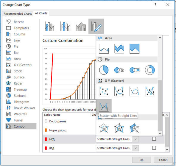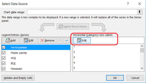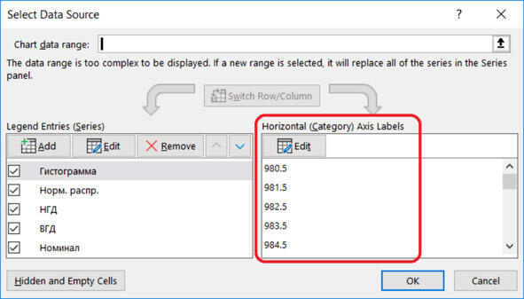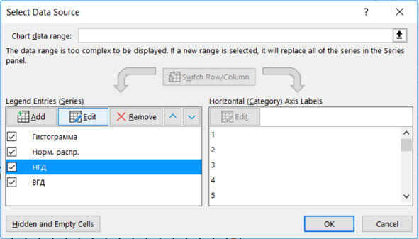 После того, как мы установили новый тип графика для границ допуска, можно задать координаты по оси «иксов». Вызываем контекстное меню графика и выбираем Select Data. Выделяем набор данных НГД в списке Legend Entries (Series). Нажимаем Edit (рис. 8.6.6).